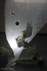 Salvaged polythene sheet, ink, and plants-not-weeds. March 2022.