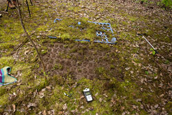 Blue Rec explores imprinting of human activity into environments by following the excavation of a brick guard that came loose from a housing development site during storms in 2017 and became embedded in local woodland. Scans were taken of the ground one, two and six months after excavation.